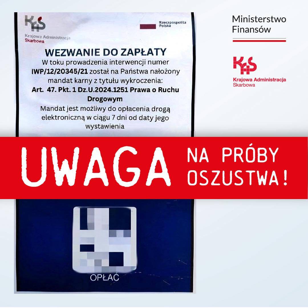 ⚠️ Ostrzegamy: przestępcy podszywają się pod KAS i rozprowadzają fałszywe wezwania do zapłaty mandatu.
